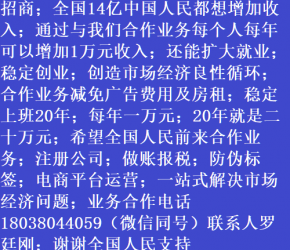 人進(jìn)寶城全國招商;合作業(yè)務(wù)減免廣告費(fèi)用;歡迎全國涉稅企業(yè)前來合作;業(yè)務(wù)合作電話 18038044059 聯(lián)系人羅廷剛